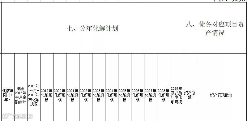 七是分年化解计划,包括化解年限(X年)、截至2018年**月余额合计、2018年**月-2018年末化解规模,以及2019年-2028年每年化解规模,2029年及以后年度化解规模等。