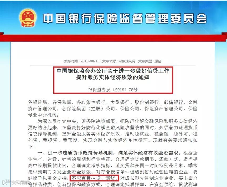 8月18日,中国银保监会办公厅发布《关于进一步做好信贷工作提升服务实体经济质效的通知》,为2018年的第76号文。