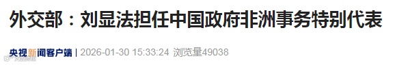 1月30日,外交部发言人郭嘉昆主持例行记者会。郭嘉昆介绍,中国政府任命刘显法担任中国政府非洲事务特别代表,刘显法特别代表是资深高级外交官,熟悉非洲事务,曾先后担任驻尼日利亚拉各斯总领事、驻肯尼亚大使、外交部部长助理、外交部驻澳门特别行政区特派员公署特派员等职。