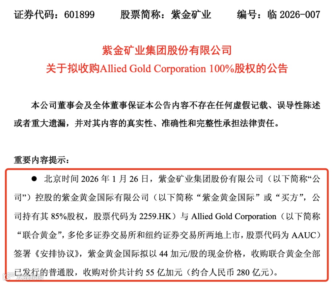 1月26日晚间,紫金矿业发布公告称,公司控股的紫金黄金国际有限公司与Allied Gold Corporation(联合黄金)签署《安排协议》,紫金黄金国际拟以44加元/股的现金价格,收购联合黄金全部已发行的普通股,收购对价共计约55亿加元。