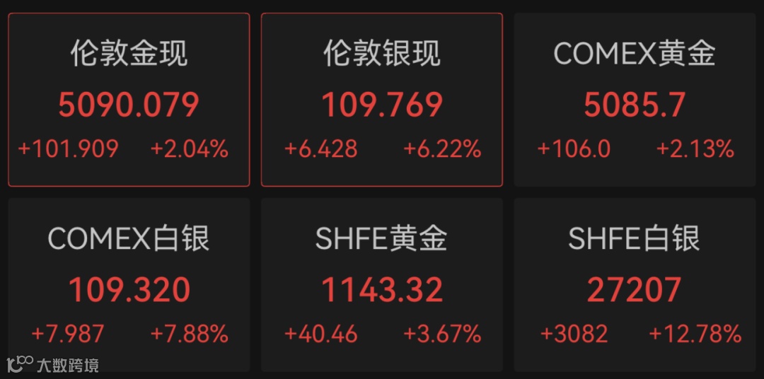 1月26日,以黄金为首的贵金属全线走强,现货黄金一度突破5100美元/盎司,截至发稿,涨幅达2.04%,报5090.08美元/盎司;现货白银大涨超6%,报109.77美元/盎司,均创出历史新高。