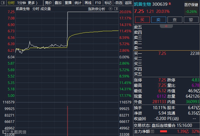 午后,医药股突然拉升,凯普生物直线涨停,海王生物、科华生物、迈克生物、金迪克等股票也陆续封死涨停板。此前,华兰疫苗、鲁抗医药、达安基因等个股已涨停。截至下午收盘,生物疫苗、流感指数涨幅超过3%,体外诊断、肝炎指数涨超2%。