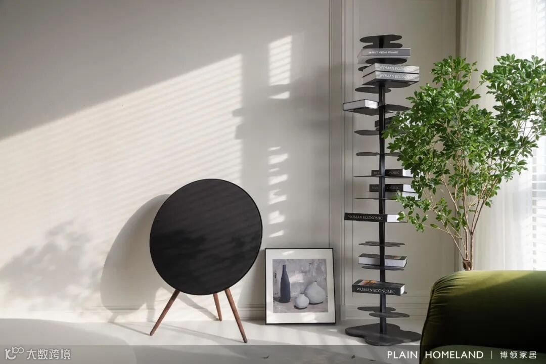 有时候放起来的深色家居也是一种点缀或装饰,与窗户一角的精致书架,复古式的圆形布艺沙发融合,使得空间更加温馨灵活而有趣。