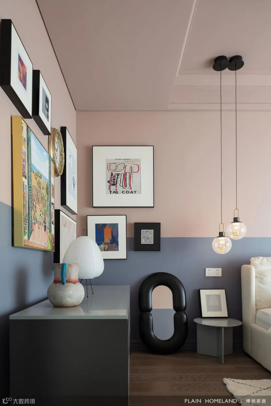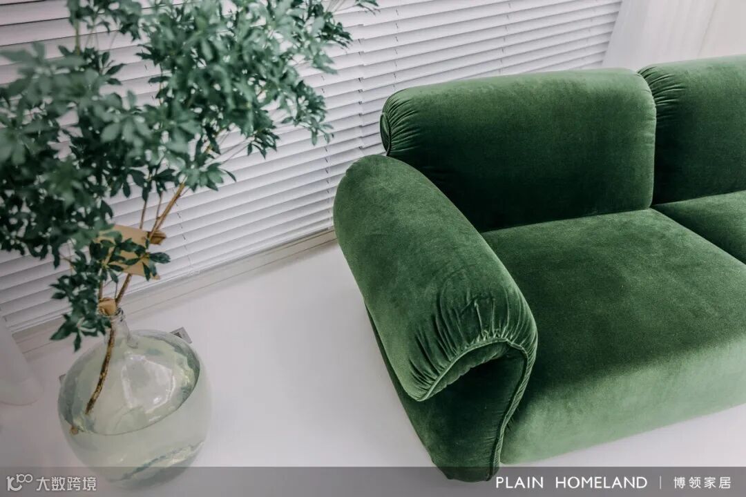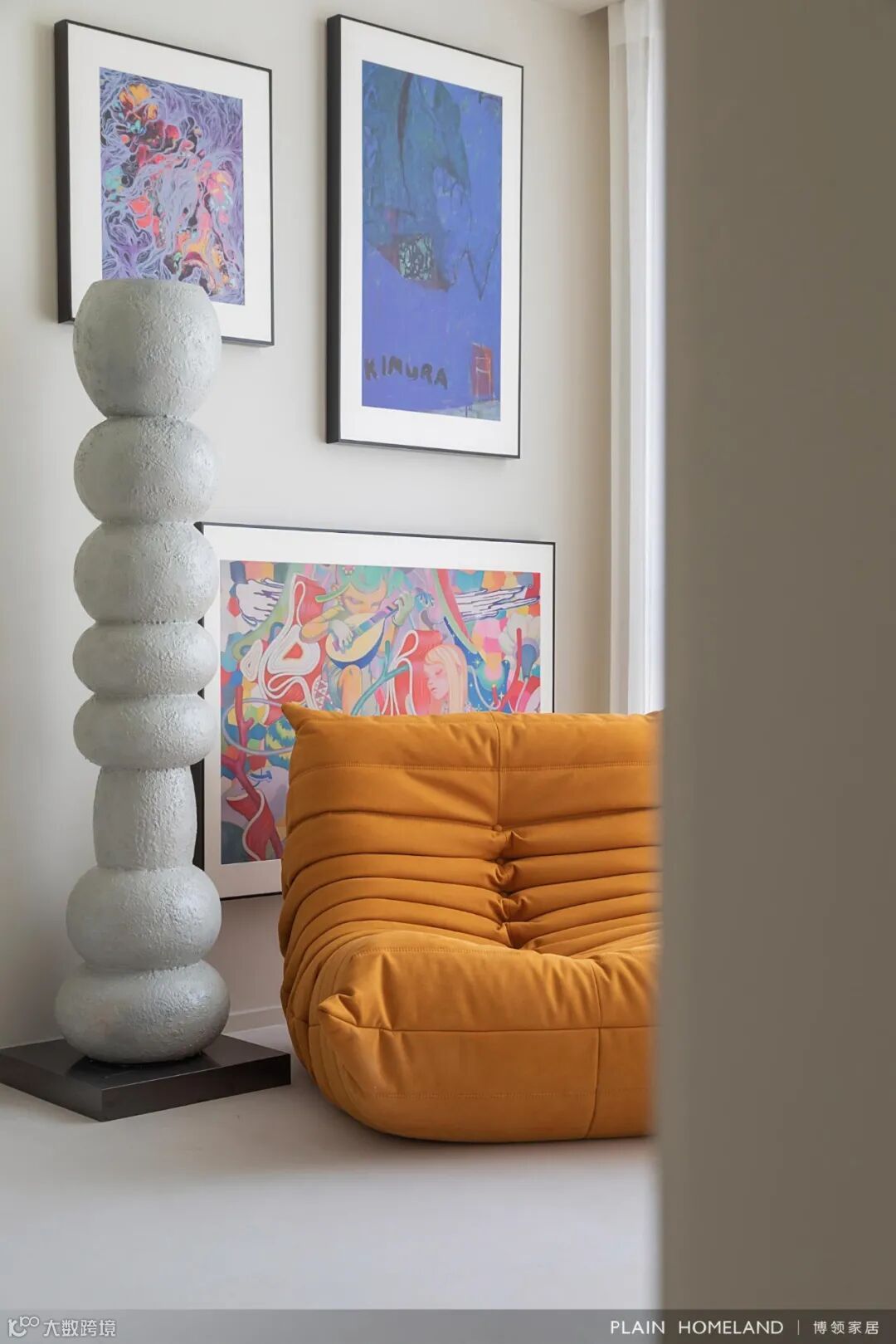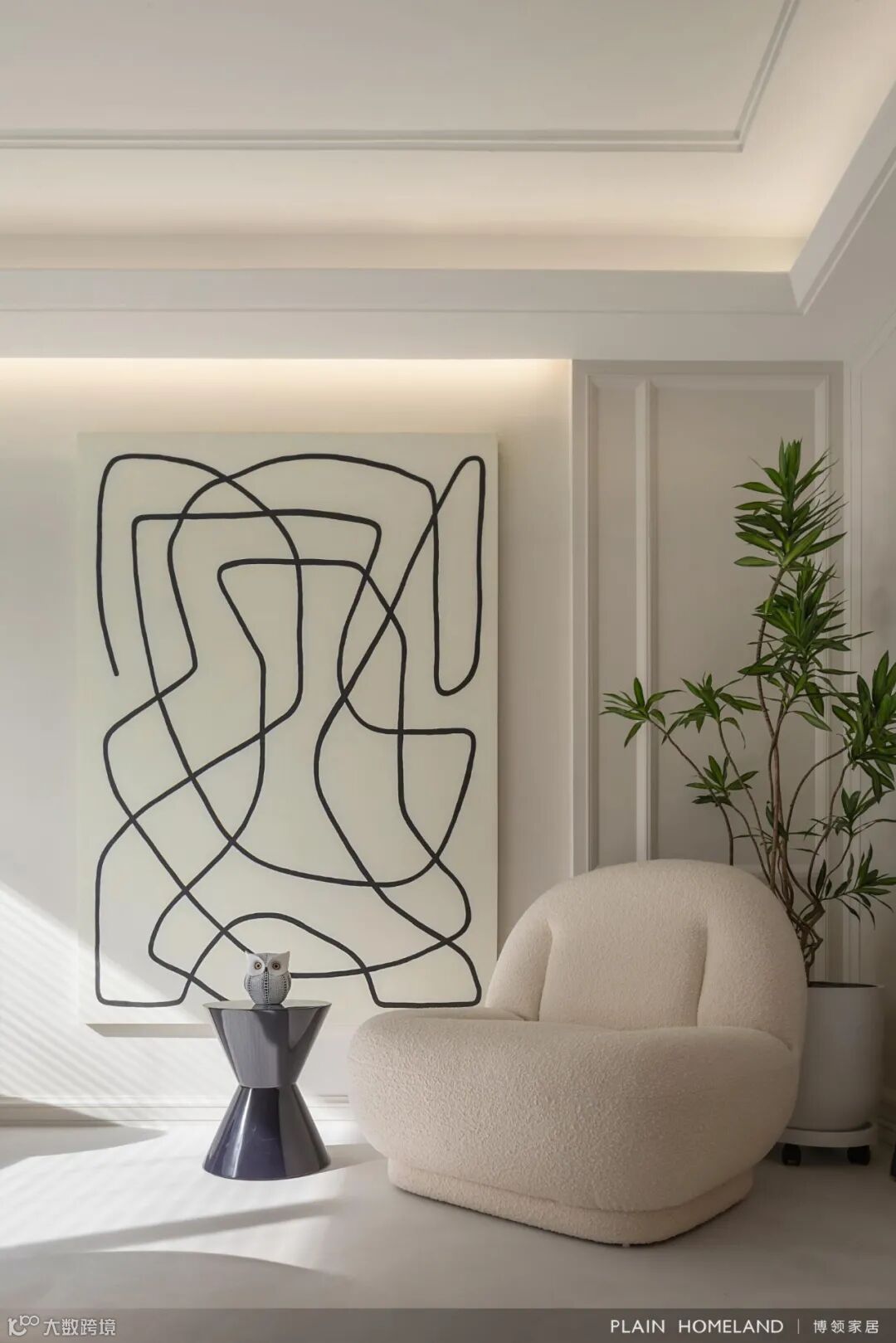 这时,俏皮可爱的大白沙发加入抽象的几何装饰画,与空间中的绿植呼应,为这方空间增添了一丝俏皮与活泼,于时尚别致中暗藏迷人可爱细节。阳光缓缓渗入,温暖流淌。