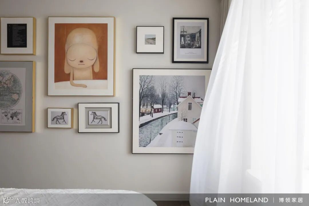 配以奢华的三角灯笼落地灯、沉稳的黑色纹理实木柜、极简的金色圆环吊灯、素雅的装饰画等轻奢有度的软装搭配,与空间轻快呼应,增添灵动装饰,且在大大的落地窗的衬托下,让卧室显得更加大气。