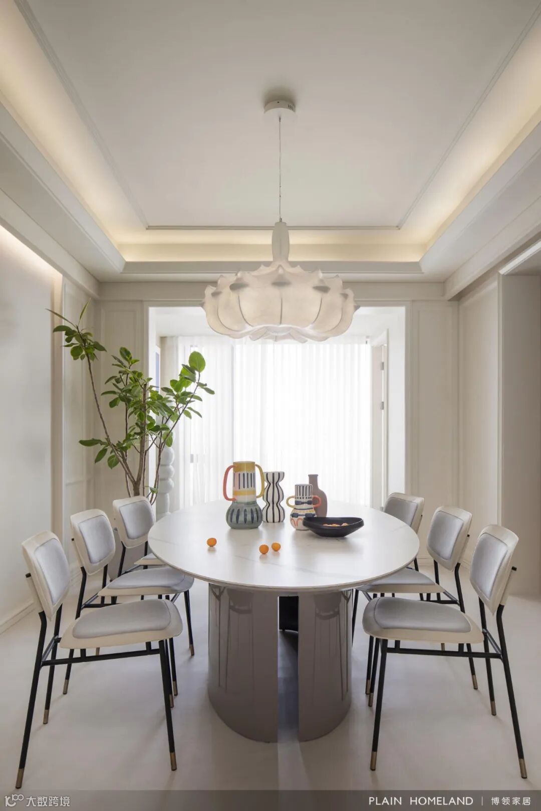 厨房和餐厅在客厅同一直线上,大理石台面+椭圆形餐桌与整个空间色调统一;餐桌顶部有一个素雅轻盈的白色花型蚕丝吊灯,让空间更饱满和谐。