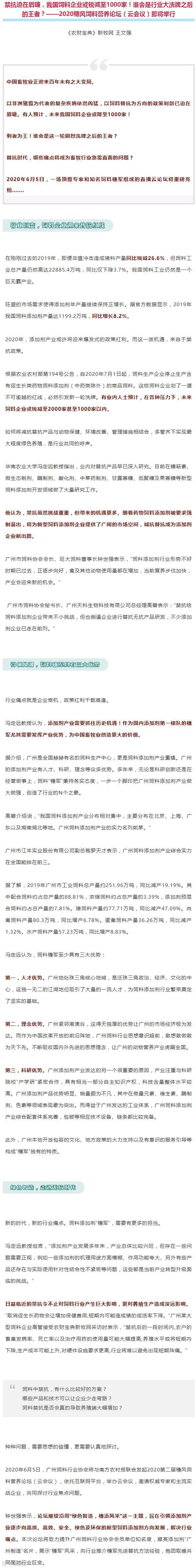 导读:禁抗迫在眉睫,我国饲料企业或锐减!谁会是行业大洗牌之后的王者?——博仕奥邀您收看2020穗风饲料营养论坛(云论坛),直击替抗新思维!