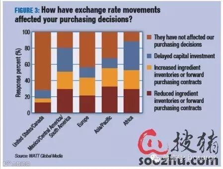 在多数地区,比如美国,汇率的变化不会影响消费者的购买决策,也不会促使他们增加饲料原料的库存量。然而,许多的受访者(主要来自拉丁美洲)表示他们将减少饲料原料的购入和期货合同的量(图3),同时也将延缓资本的投资。