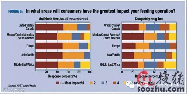 消费者的认知和态度使家禽饲料配方出现了一些变化。虽然非转基因和有机产品在一些地区排名很高,而“无抗”和“无药物添加”对饲料公司的发展所致的影响势不可挡(图5)。