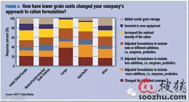虽然当前粮食的价格下降,但是全球粮食市场的波动对全球家禽饲料的生产商来说仍然十分重要。粮食成本的降低促使许多公司重新审视他们的饲料配方。受访者表示,他们已经改变了饲料成分的来源并增加了饲料的营养密度(图4)。