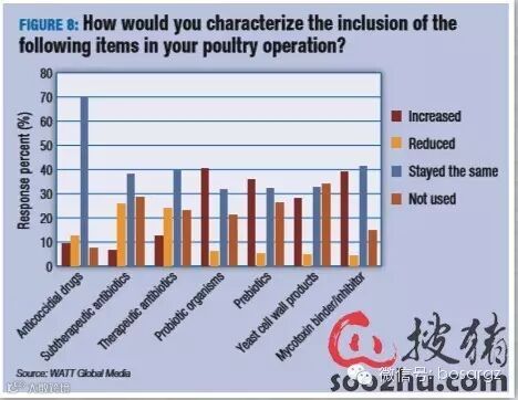 倡导消除饲料中不受欢迎的添加剂成为一种流行趋势,这一点不足为奇。总体而言,受访者表示不使用或者减少使用低剂量抗生素以及医疗抗生素(图8)。