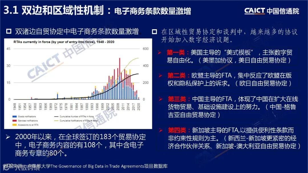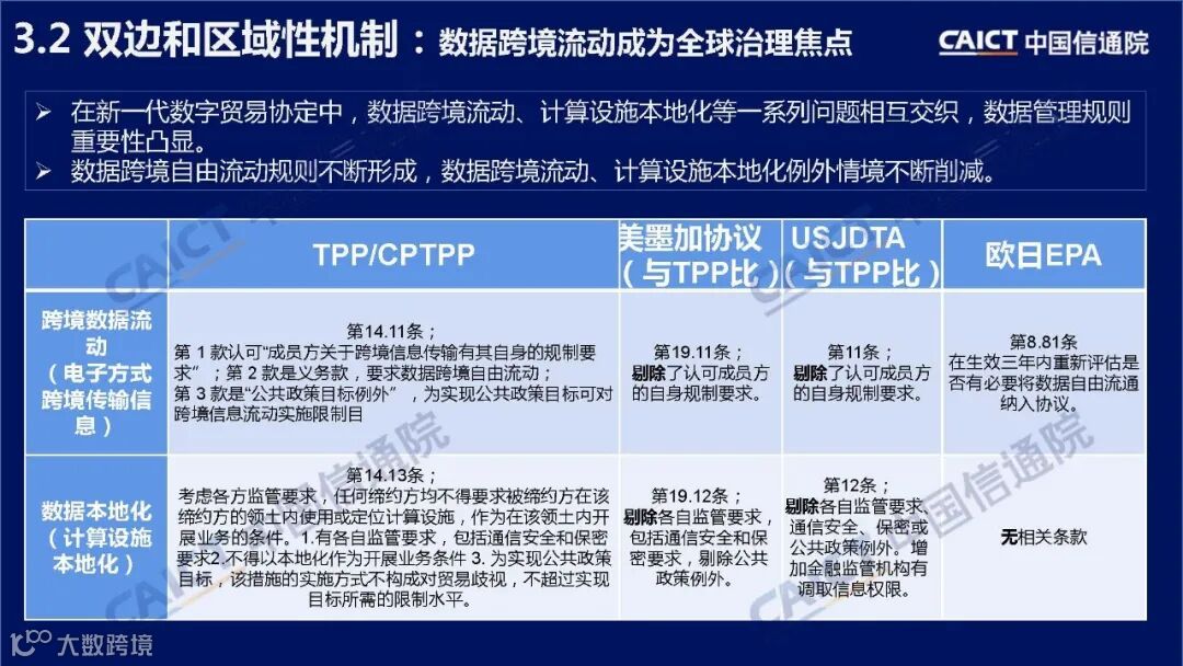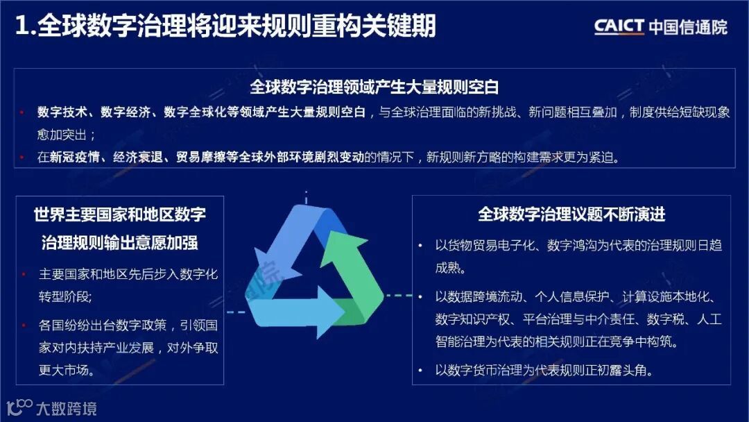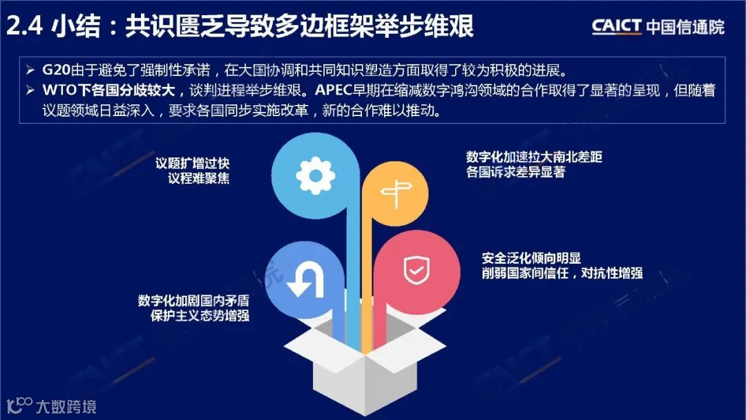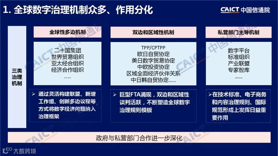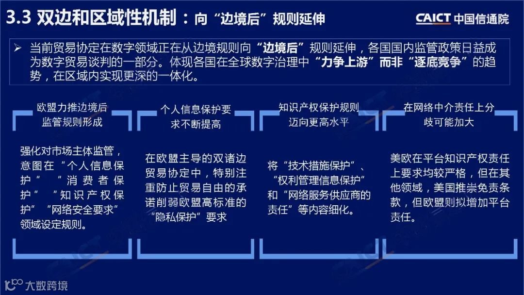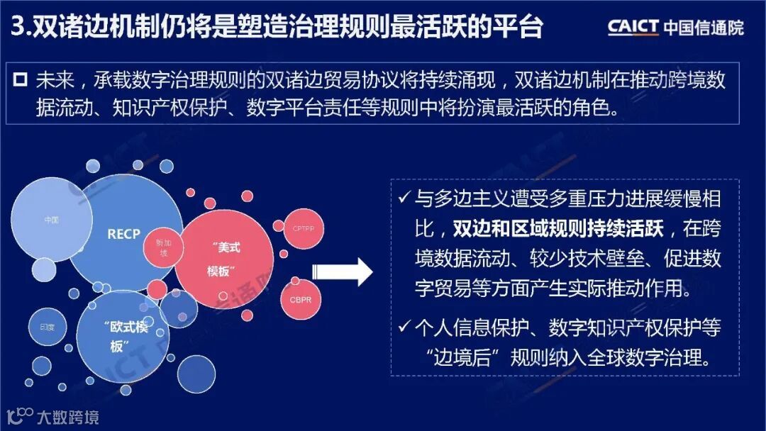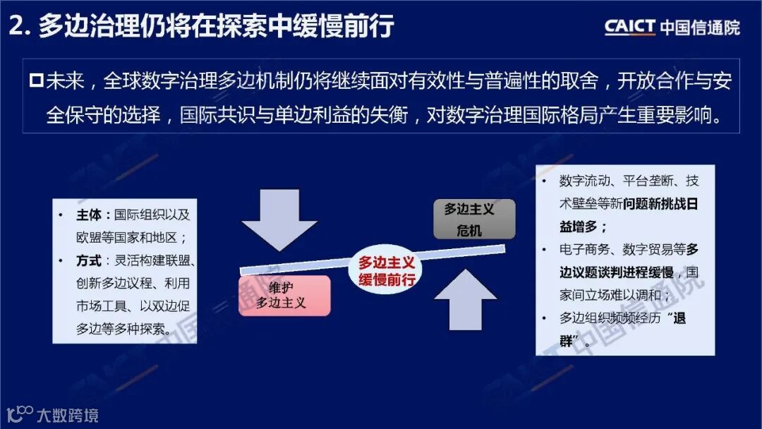 全球数字治理多边主义遭受多重压力进展缓慢,双边和区域机制保持活跃,在跨境数据流动、减少技术壁垒、促进数字贸易等方面产生实际推动作用,并将个人信息保护、数字知识产权保护等“边境后”规则纳入全球数字治理。
