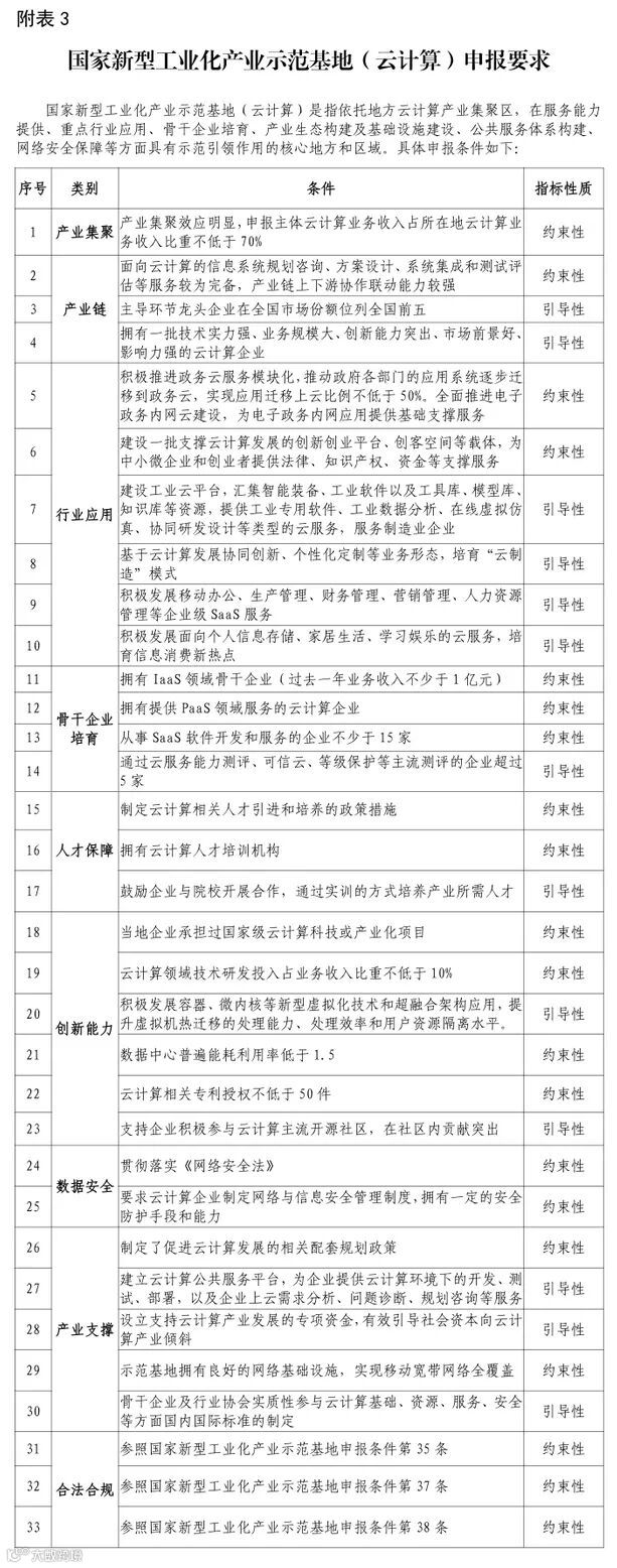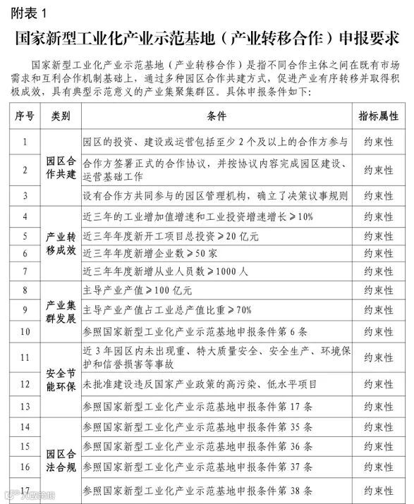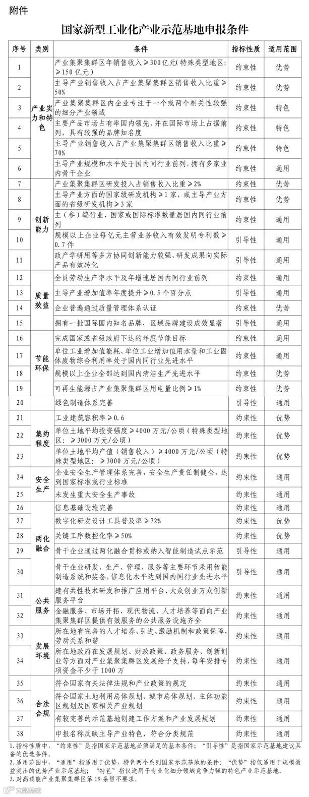 1.申报对象须满足《管理办法》所规定的条件(装备制造业、原材料工业、消费品工业、电子信息产业、软件和信息服务业、高技术转化应用领域示范基地申报条件参照附件,部分新兴领域示范基地申报条件参照附表1~5),且未出现以下情况:近三年发生重大或特别重大生产安全事故;近三年发生Ⅱ级或Ⅰ级突发环境污染事件;申报对象在国务院及有关部门相关督查工作中发现存在严重问题。