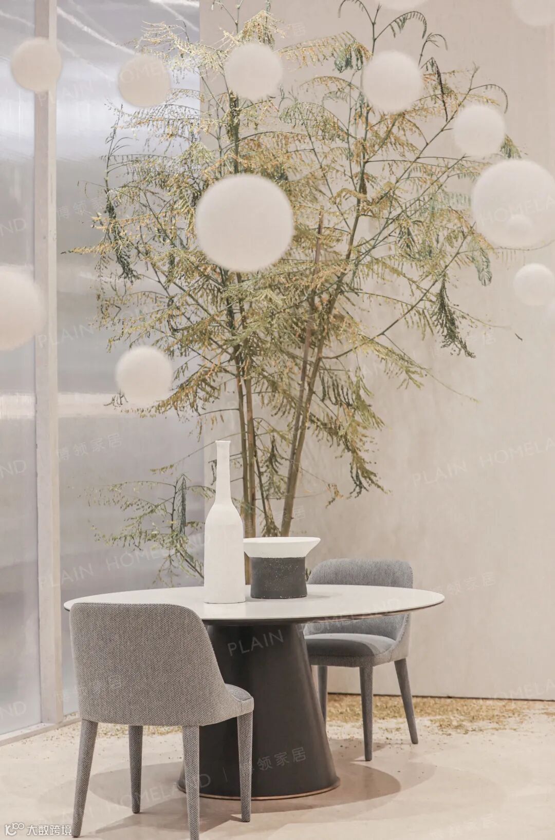 睡卧主题的空间中,沉稳的灰色以及融合的光线,通透的玻璃衣柜,在喧闹的OXME傲觅展馆里营造出一种时间静止、恬静静谧的氛围。