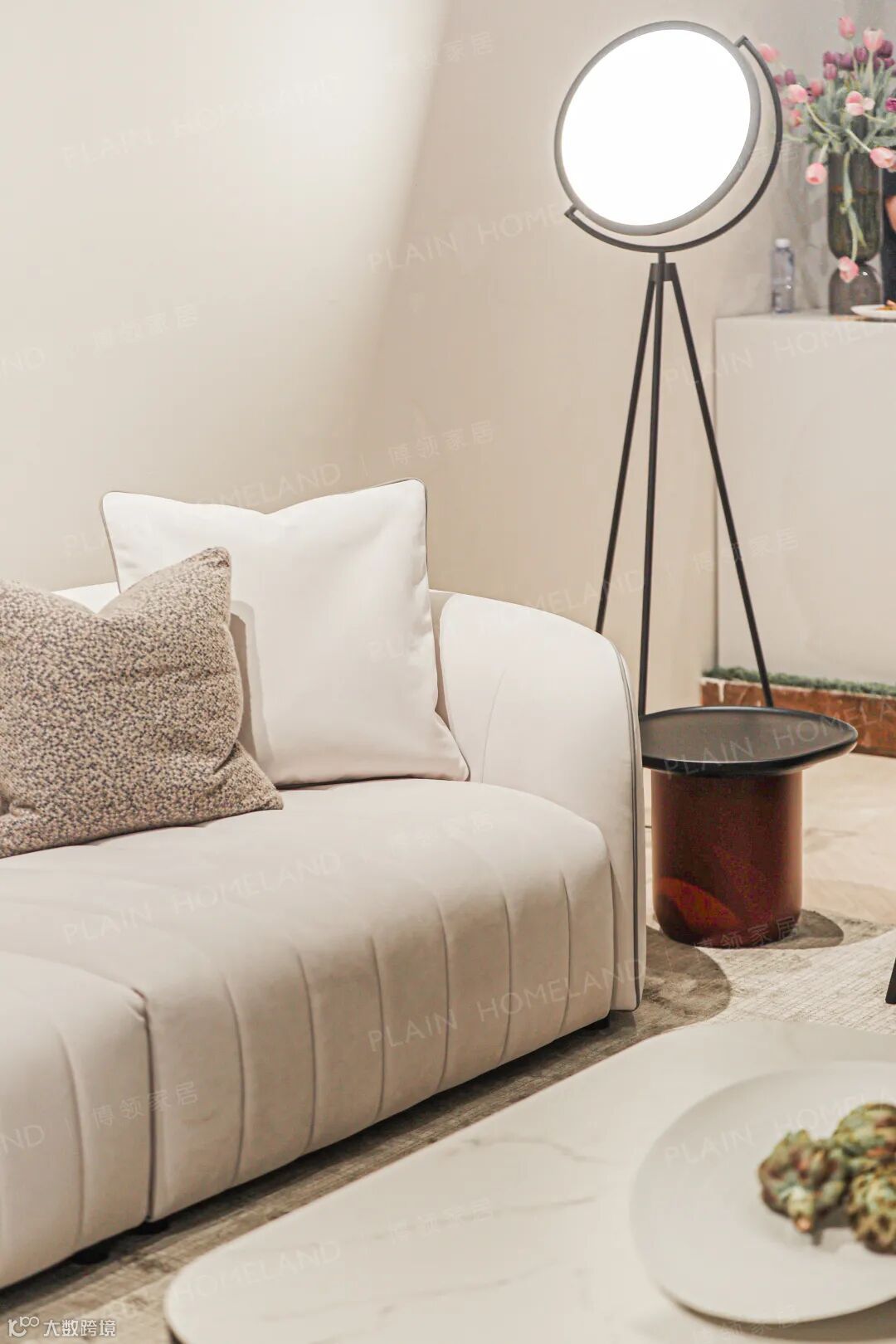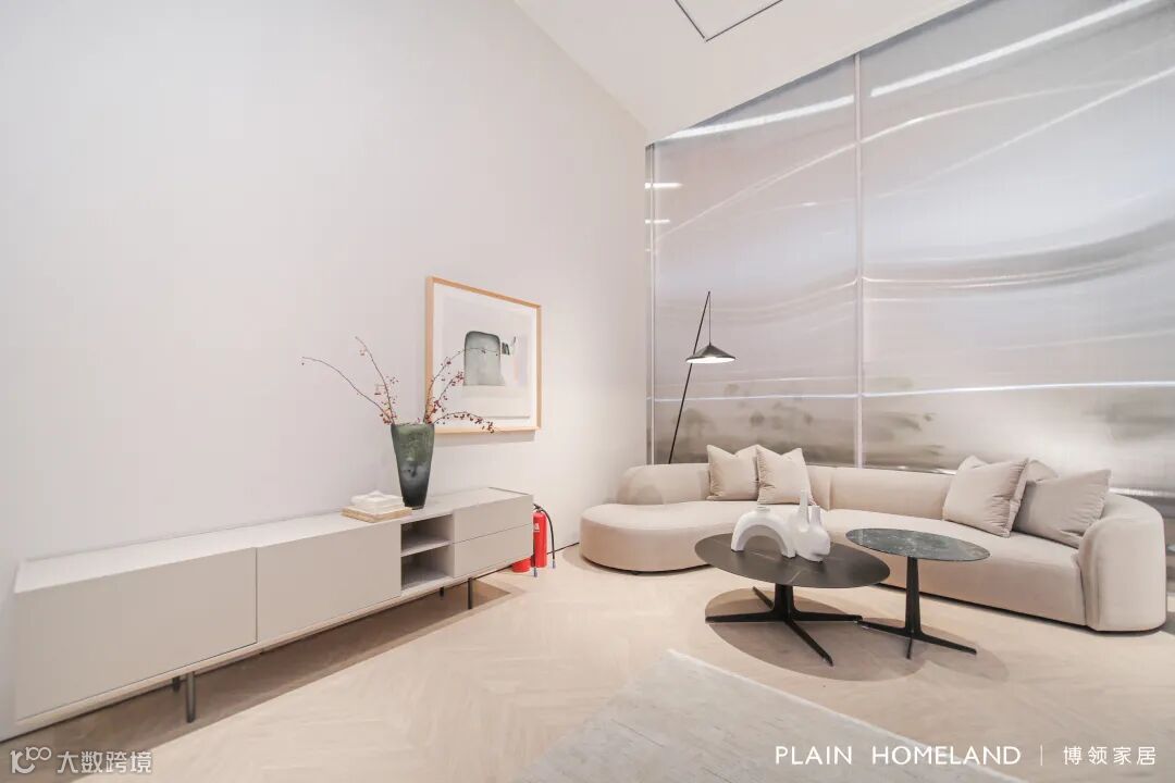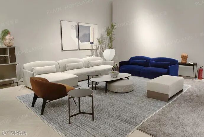 另一边的客厅区域应用OXME傲觅畅销款MOON沙发打造一个对谈与休憩兼具的空间,一套专门为大空间设计的展示场域,也为全世界的居家爱好者提供了一个理想生活的范本。
