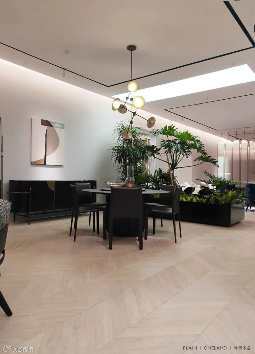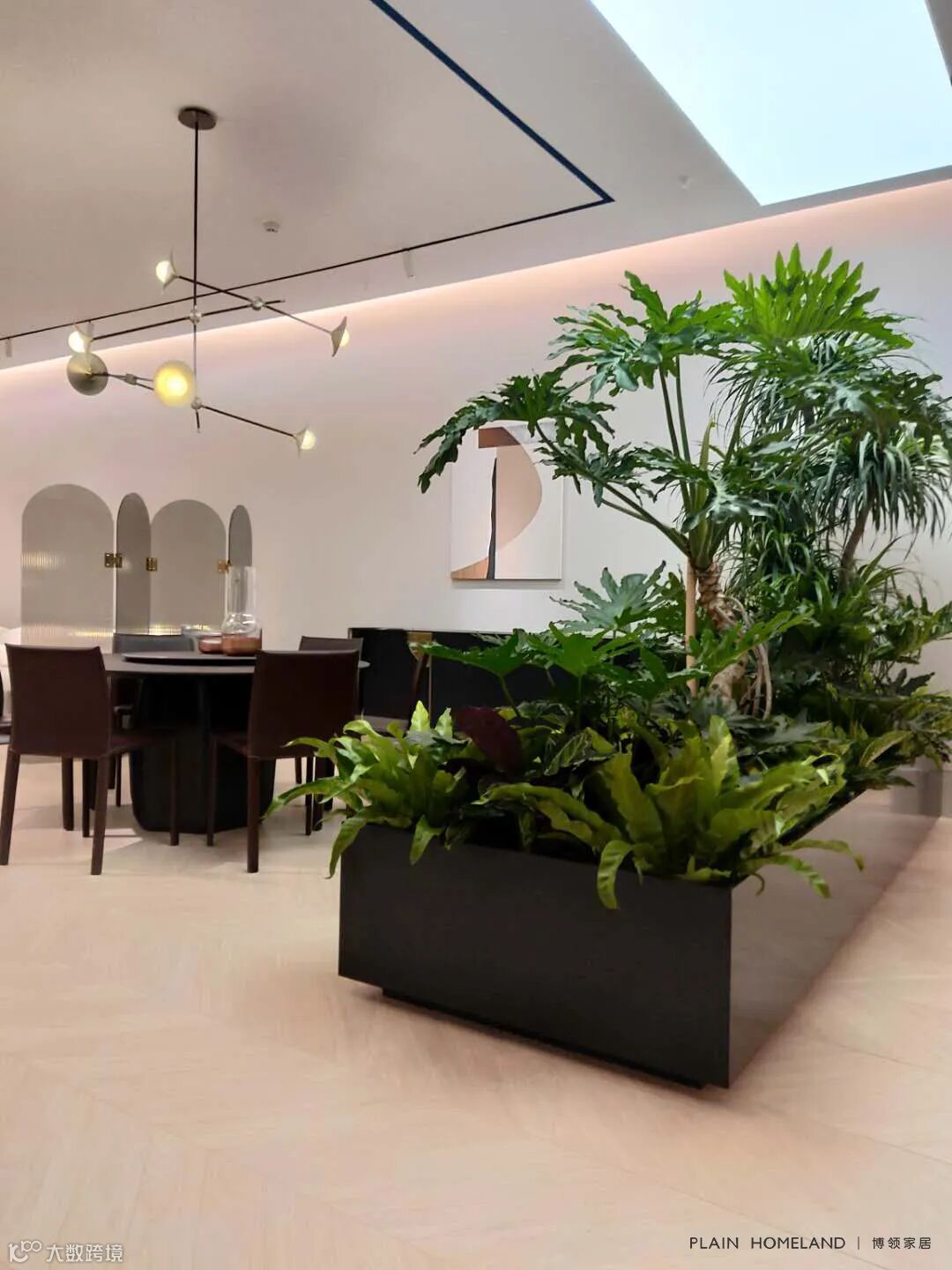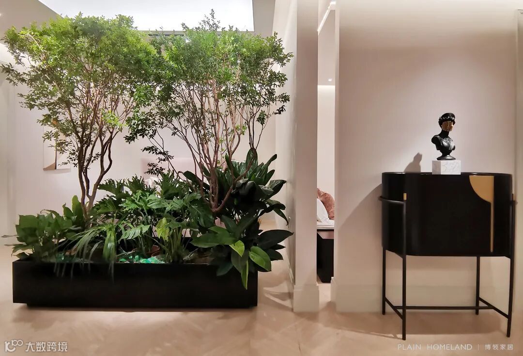 将自然绿植“延请入室”,划分各个分区,既不繁复冗杂又增强整个空间的清新自然感,虽称不上一步一景,但也在不经意间缓解参观者的视觉压力,不刻意却很贴心。