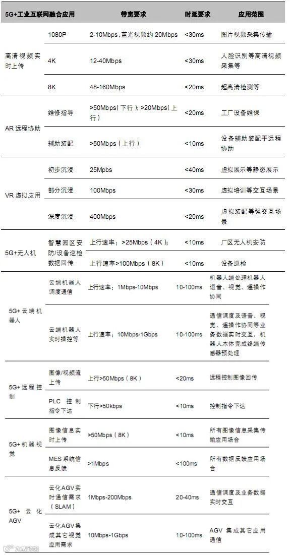 5G高带宽、低时延、支持海量接入等方面的优势,具备与工业互联网融合的潜力。按照工业互联网产业联盟发布的报告显示,未来在八大类新型场景上,5G和工业互联网合作的可能性比较高,分别为5G+超高清视频、5G+AR、5G+VR、5G+无人机、5G+云端机器人、5G+远程控制、5G+机器视觉以及 5G+云化 AGV(自动引导运输车)。
