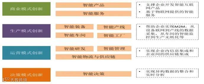 从互联网角度看,主要是由外而内,外部的商业互联网创新业务拉动内部生产组织和制造模式的改造,主要业务包括精准营销、个性定制、众包众创、协同设计、协同制造等。