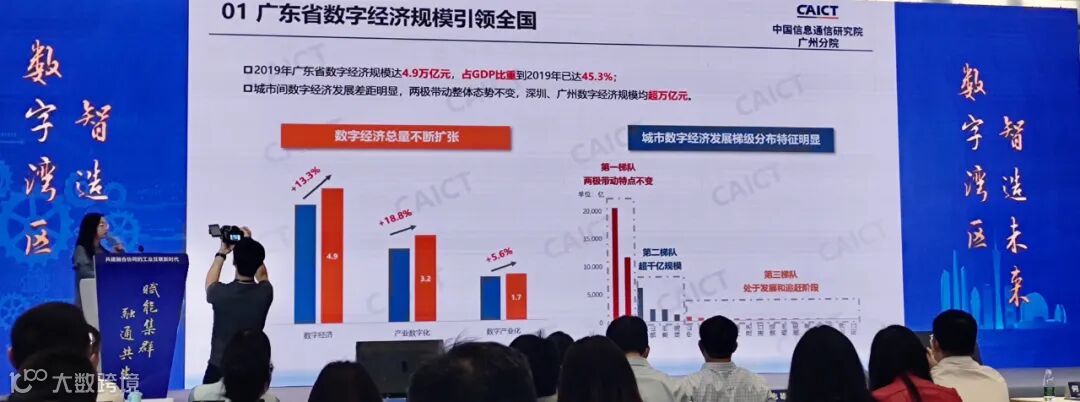 会议上,中国信通院广州分院同步发布了《粤港澳大湾区数字经济发展与就业报告(2020年)》。报告指出,广东省数字经济规模引领全国,2019年广东省数字经济规模达4.9万亿元,占GDP比重已达45.3%,深圳、广州数字经济规模均超万亿元。其中,产业数字化正加快推进,2019年产业数字化规模达3.18万亿,较上年增幅达18.8%,工业数字化转型逐步推进。同时,数字化治理能力显著提升,数据价值化步伐加快,数字经济吸纳就业数量持续攀升。