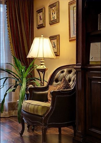 本案就采用纯正的美式古典风格,设计师考虑尽量多地采用玻璃门和合理利用飘窗,同时巧妙的运用灯光的效果避免了美式古典风格色彩过于暗淡的情况发生。