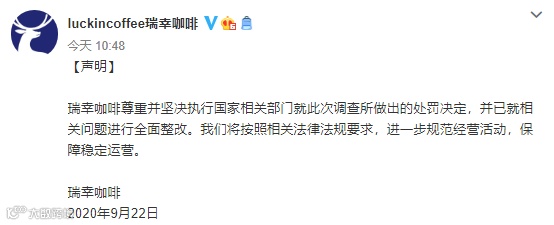 随后,瑞幸咖啡官微发表声明:瑞幸咖啡尊重并坚决执行国家相关部门就此次调查所做出的处罚决定,并已就相关问题进行全面整改。我们将按照相关法律法规要求,进一步规范经营活动,保障稳定运营。