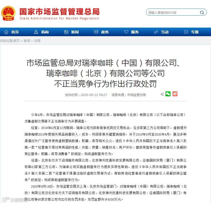 市场监管总局9月22日公告称,瑞幸咖啡(中国)有限公司、瑞幸咖啡(北京)有限公司及相关43家为其提供实质性帮助的第三方公司,因存在(帮助)虚假宣传行为被处罚金6100万。这是自4月份瑞星咖啡被调查以来,受到了的第一个处罚结果。