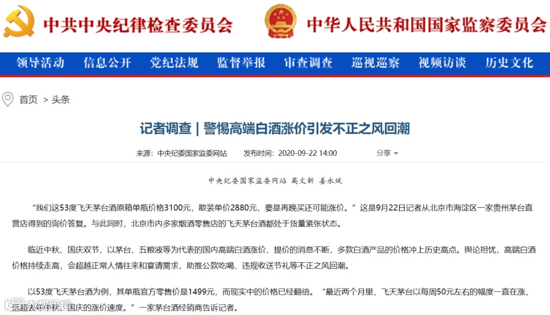 今天下午两点,中纪委网站显要位置突然发布题为《警惕高端白酒涨价引发不正之风回潮》一文。文中指出,临近中秋、国庆双节,以茅台、五粮液等为代表的国内高端白酒涨价、提价的消息不断,多款白酒产品的价格冲上历史高点。舆论担忧,高端白酒价格持续走高,会超越正常人情往来和宴请需求,助推公款吃喝、违规收送节礼等不正之风回潮。