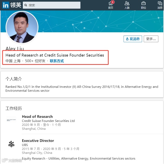 从刘帅的公开简历来看,他曾在北京大学和香港大学获得学士、硕士学位,并在瑞银工作期间获得社科院的金融博士学位。在工作经历方面,其信息登记为高盛的分析师(Equity Research Analyst)和瑞银的执行董事(executive director)。目前,刘帅的职业信息已更新为瑞信方正证券的研究主管(Head of Research)。