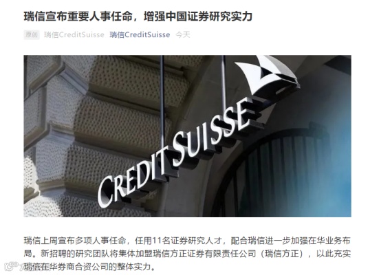 日前,瑞信官方微信公众号公布该公司多项人事任命。据介绍,瑞信任用11名证券研究人才,配合瑞信进一步加强在华业务布局。新招聘的研究团队将集体加盟瑞信方正证券有限责任公司(瑞信方正),以此充实瑞信在华券商合资公司的整体实力。