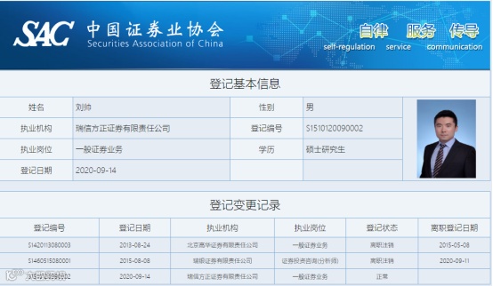 中证协信息显示,刘帅在2013年8月初次登记,执业机构为北京高华。此后,2015年8月,刘帅执业信息变更为瑞银证券,任职5年有余。今年9月,刘帅执业信息正式变更为瑞信方正证券。