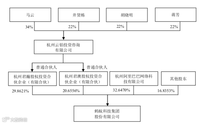 招股书显示,杭州君瀚、君澳作为蚂蚁的员工持股平台,分别持有蚂蚁29.8%和20.6%的股份,此外阿里巴巴集团(持股32.6470%)。发行完成后,君瀚、君澳合计持股将不低于40%。马云为蚂蚁集团实际控制人,招股书显示,发行前马云个人持有26.77亿股蚂蚁股份(约8.5%)。