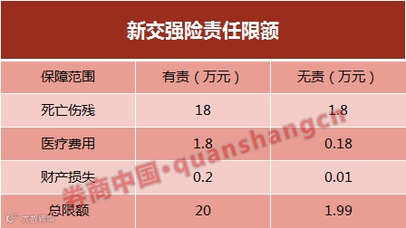 死亡伤残赔偿限额从11万元提高至18万元,医疗费用赔偿限额从1万元提高至1.8万元,财产损失赔偿限额维持0.2万元不变。