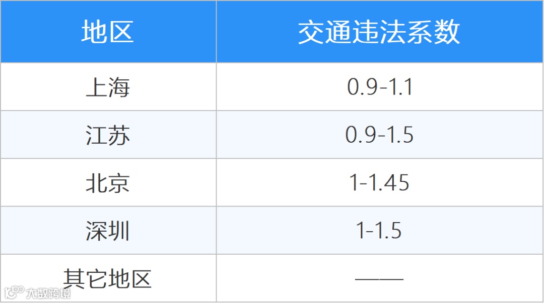 交通违法系数目前只涉及到四个地区上海、江苏、北京、深圳。例如北京新版费改条款中,在保留原来的无赔款优待及上年赔款记录系数(以下简称NCD系数)的基础上,引入了交通违法浮动系数。车主闯红灯、超速等违法行为将导致保险费率上浮,最高可上浮45%。