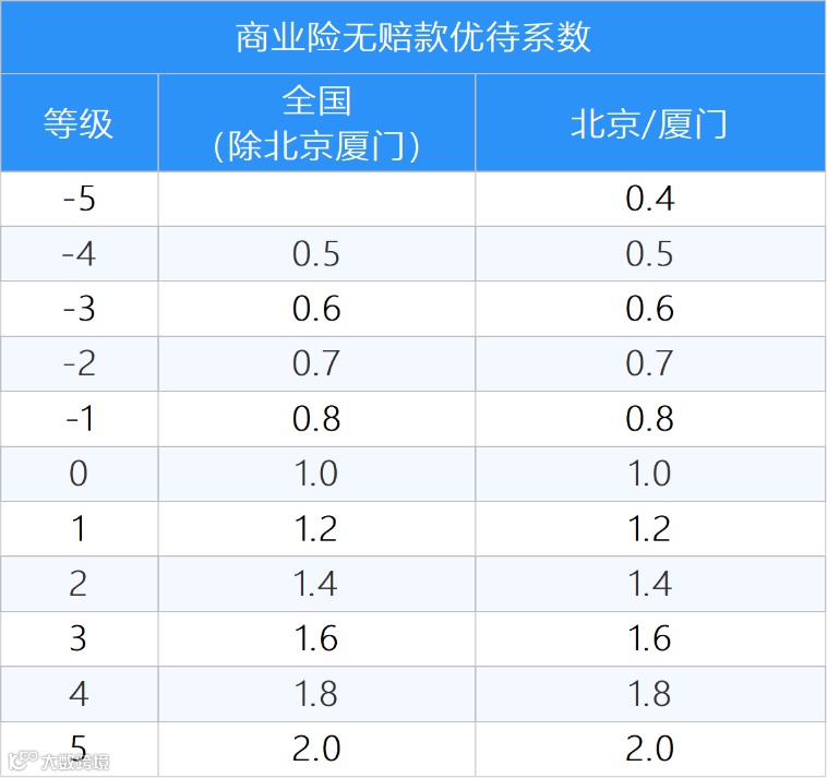 另一方面,无赔款优待系数规定进一步优化,北京和厦门一类分为11个等级,系数范围为0.4-2.0全国其它地区分为10个等级,系数范围为0.5-2.0。