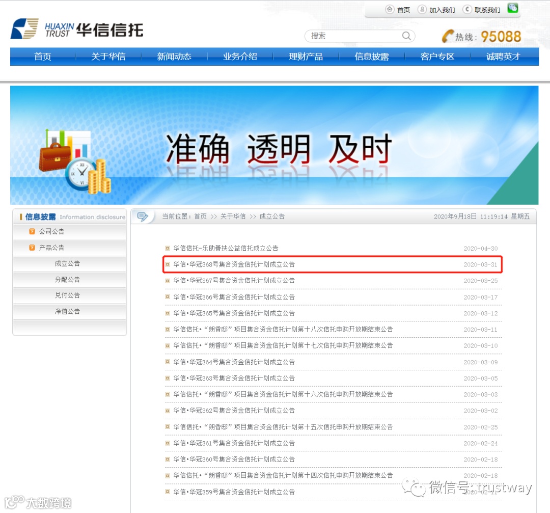 华信信托官网显示,该司最近一只集合信托产品成立于2020年3月31日,产品名称为华信·华冠368号集合资金信托计划,此后华信信托仅发布过一款慈善信托的成立公告。
