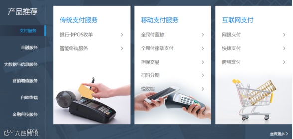 支付专业相关的技术和大数据业务。比如,大数据与信息服务方面,基于支付数据,为政府、银行、保险等金融机构量身提供包括智库分析、智能化风控、实名认证、商业智能等多元化解决方案;面向中小微企业的商务开放平台,ERP及综合收银服务等。此外,还有CFCA,包含全球可信数字证书体系、电子合同解决方案,以及金融科技产品认证。