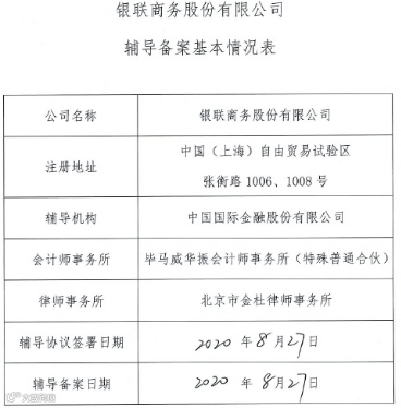 从9月1日上海证监局官网最新公告看,2020年8月,中金公司与银联商务签订了《银联商务股份有限公司(作为辅导对象)与中金公司(作为辅导机构)关于首次公开发行人民币普通股(A 股)股票与上市之辅导协议》。参与辅导的律所还有北京金杜、会计师事务所毕马威华振。