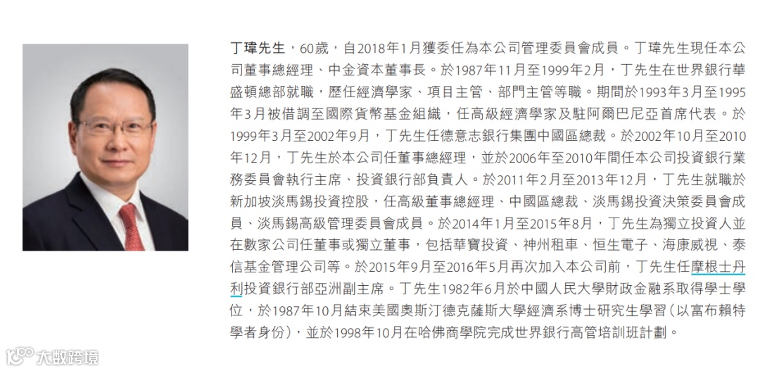 回顾丁玮本人的工作经历,与一众中金高管类似,丁玮兼具经济学家的背景和丰富的海外投行经验。早在1987年,丁玮就曾在世界银行华盛顿总部就职,任职超过11年;期间曾被借调至国际货币基金组织,任高级经济学家及驻阿尔巴尼亚首席代表。此后,1999年3月,丁玮任德意志银行中国区总裁,后在2002年10月加入中金。