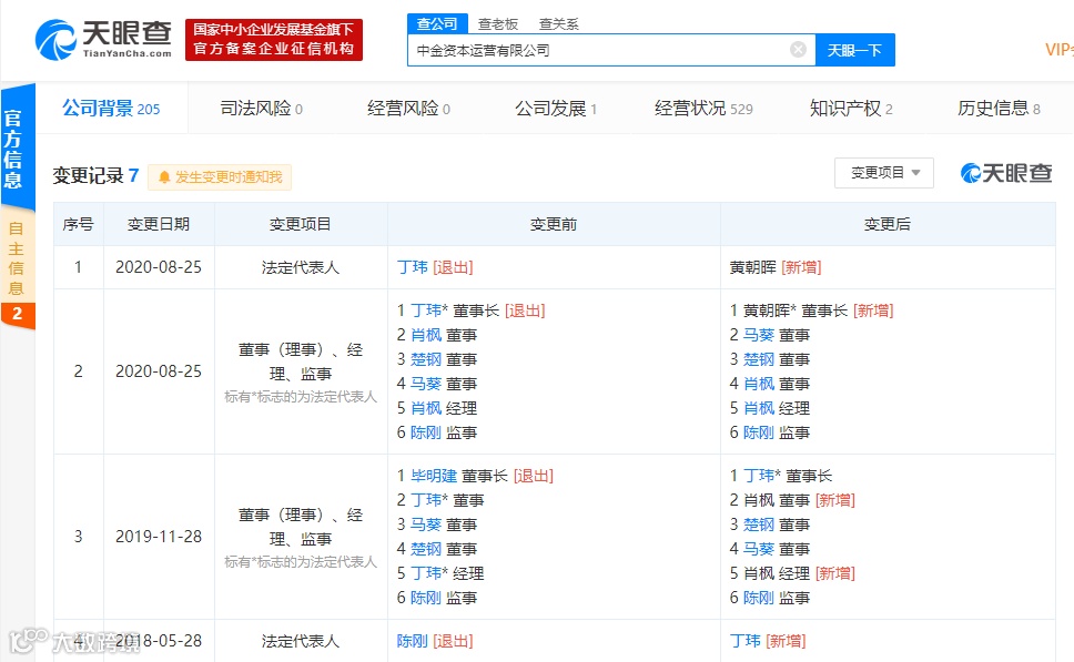 天眼查信息显示,8月25日,中金资本运营公司的董事长、法定代表人同时发生变动,中金老将丁玮离任,由中金CEO黄朝晖暂代。对此,中金方面向券商中国记者表示,丁玮系因年龄原因辞任。