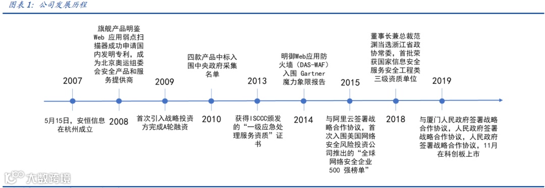 2007年成立之初,安恒信息便以应用安全和数据安全作为切入点,推出市场首创性产品数据库审计与风险控制系统与Web应用防火墙产品,成功进入网络信息安全市场。
