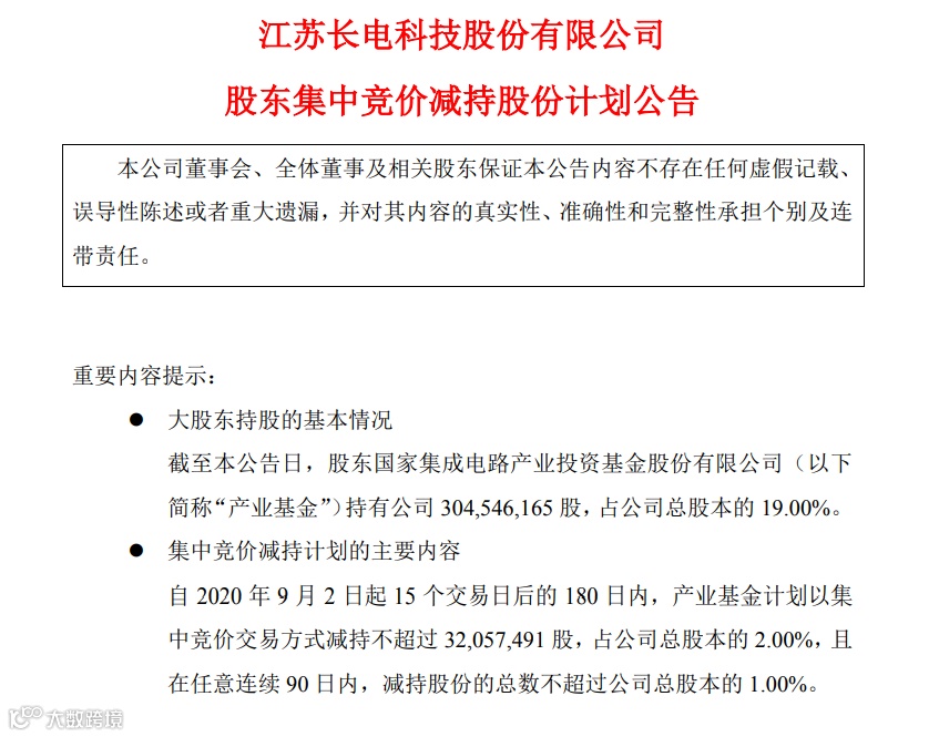 值得一提的是,大基金是长电科技第一大股东,此次则是首次出手减持该公司。公告显示,大基金持有长电科技3.05亿股,占总股本19%;减持股份来自发行股份购买资产取得及非公开发行取得的股份。
