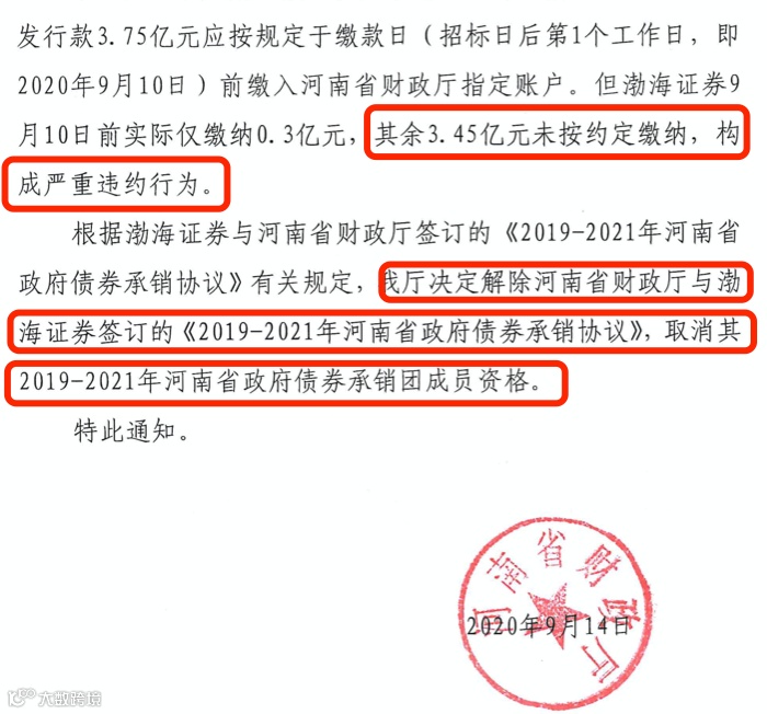 9月21日,河南省财政厅发布红头文件,宣布取消渤海证券2019~2021年河南省政府债券承销团成员资格。原因竟是因为渤海证券未能在规定时间(9月10日)前完成3.75亿元发行款的缴纳,仅实际缴纳0.3亿元,构成严重违约。