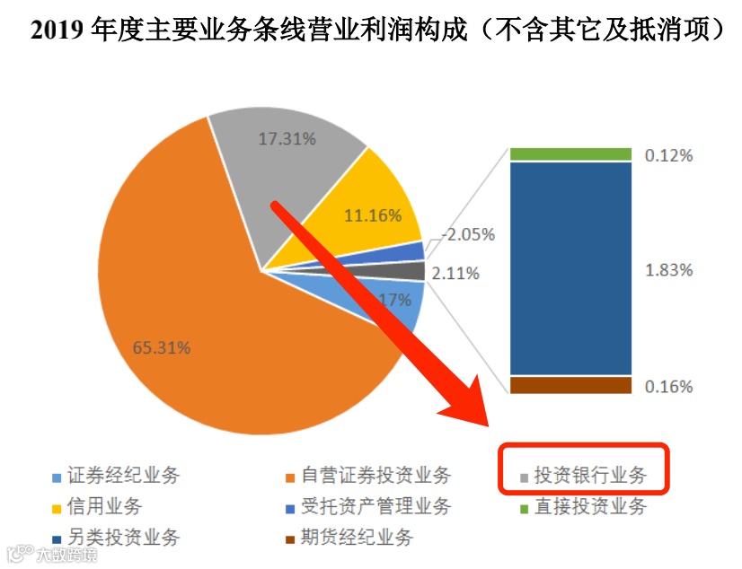 2019年年报显示,渤海证券主要业务条线营收总和为28.05亿元,自营业务营收占比最大为54.15%,较上年增长126.21%,经纪业务、投行业务营收分别仅占15.57%和14.89%,其中投行业务营收为4.18亿元,同比增加95.28%。