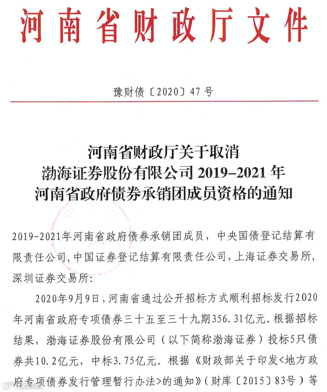 鉴于此,河南省财政厅公告称,决定解除与渤海证券此前签订的承销协议,取消其2019-2021年河南省政府债券承销团成员资格。