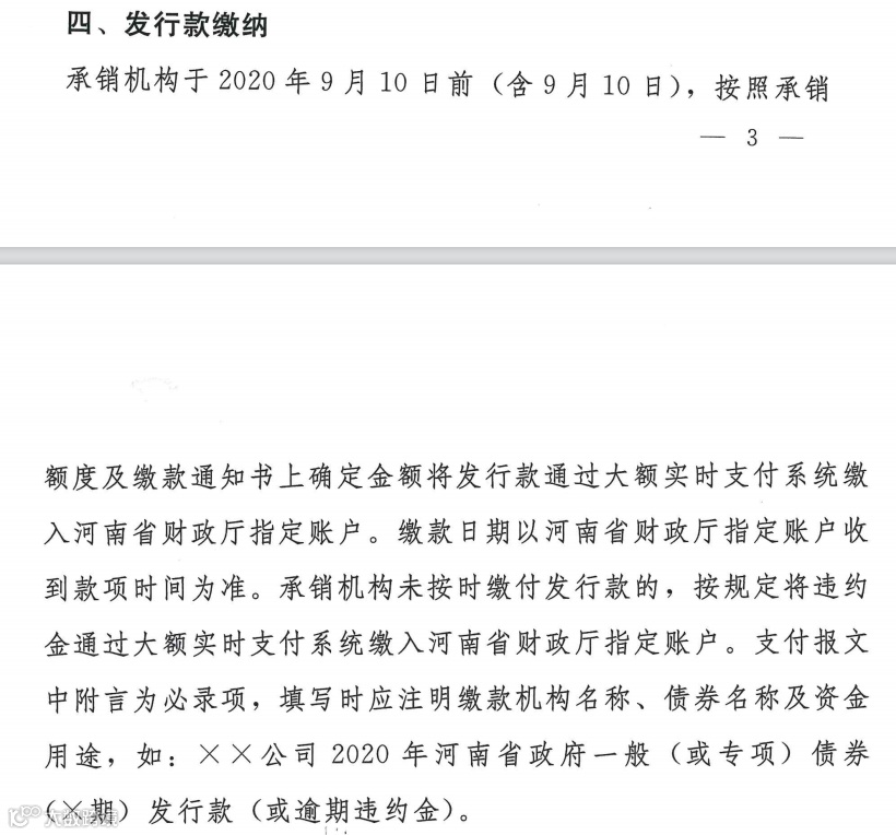 券商中国记者翻阅《河南省财政厅关于发行2020年河南省政府专项债券(三十五至三十九期)有关事项的通知》发现,若承销机构未按时缴付发行款,则将按规定将违约金通过大额实时支付系统缴入河南省财政厅指定账户。