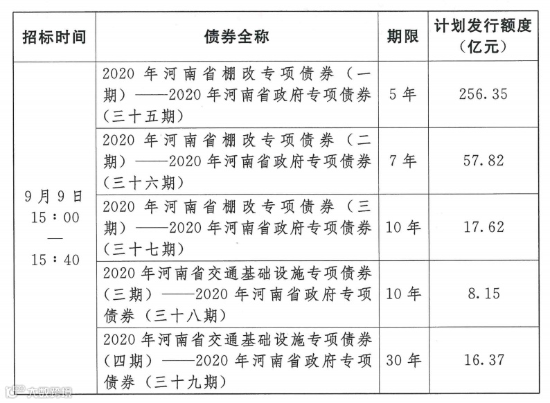 2020年9月9日下午3点,2020年河南省政府专项债券35至39期的发行招标正式启动,5期债券合计发行规模达356.31亿元。