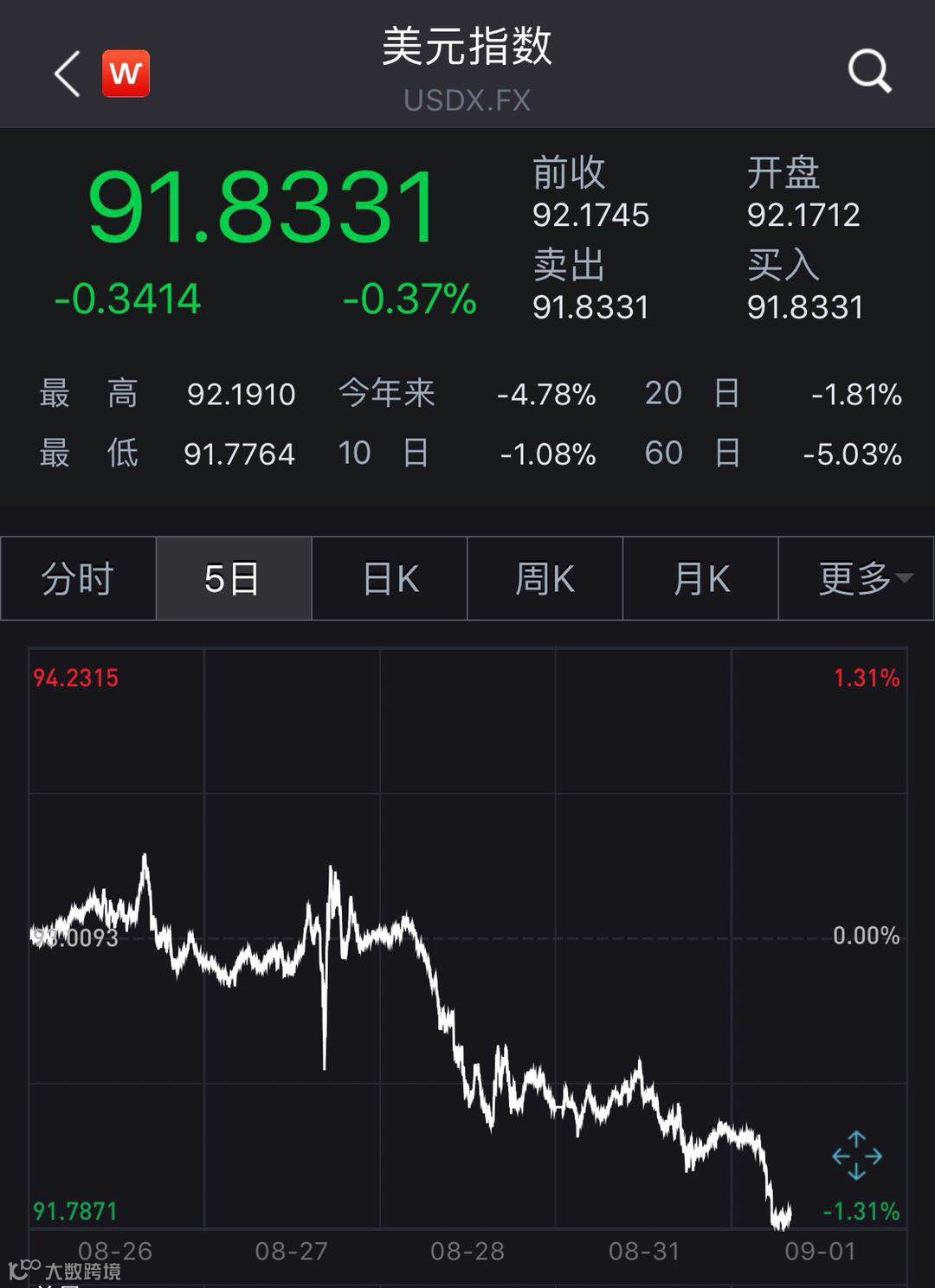 9月1日周二早盘,美元指数开盘报92.172,之后一路下探跌破92美元关口,创下27个月新低,较今年3月最高点103美元下跌超10%。美元指数持续疲软下,包括人民币兑美元汇率等在内的部分非美货币走强。截至下午4点左右,在岸人民币兑美元汇率升破6.82,大涨340点报6.8195。