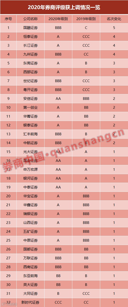 在2019年评级结果颇为严格的情况下,2020年券商评级上调的数量也明显增长。相比之下,2020年共有32家券商的评级结果较上年有所提升。