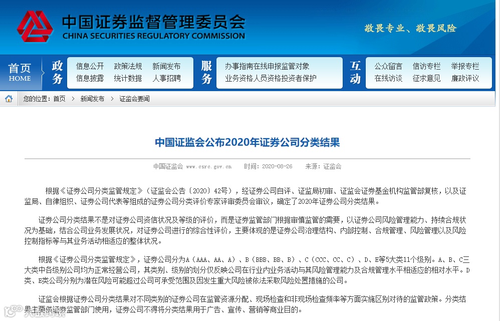 受疫情影响,今年的券商分类评价结果来得虽然较往年略晚,但整体评价周期已有明显提速。在7月中旬开启自评后,不到一个半月时间,评价结果就已落地。8月26日晚间,证监会官网挂出了2020年证券公司分类结果。