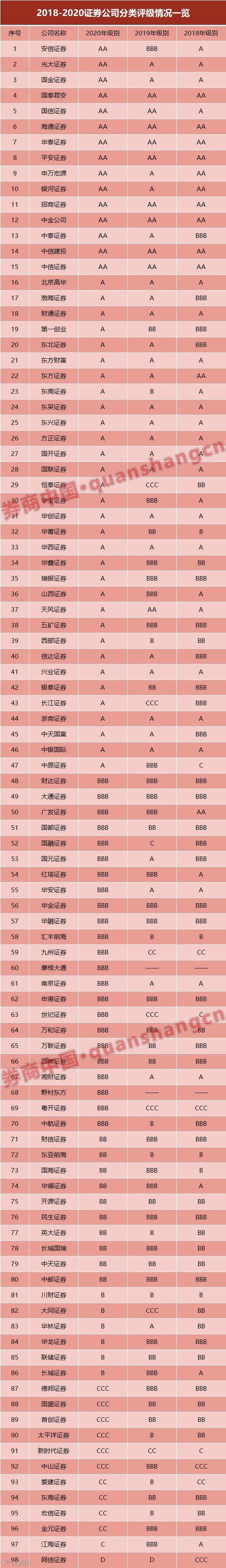国泰君安、招商证券已连续13年保持AA级,2008年到2020年历次评级中都是AA级,中信建投也连续11年获得AA级。也有多家券商首次入选A类和A级,比如五矿证券,就是首次获评A级。也有多家券商首次入选A类和A级,比如五矿证券,今年就是首次获评A级。
